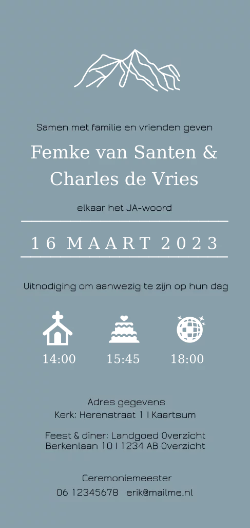 Chique staande trouwkaart met echt goudfolie op de voorzijde. Met bergen, wedding icons en lijnen. Zelf tekst aanpassen! Extra lang formaat 10x21cm!