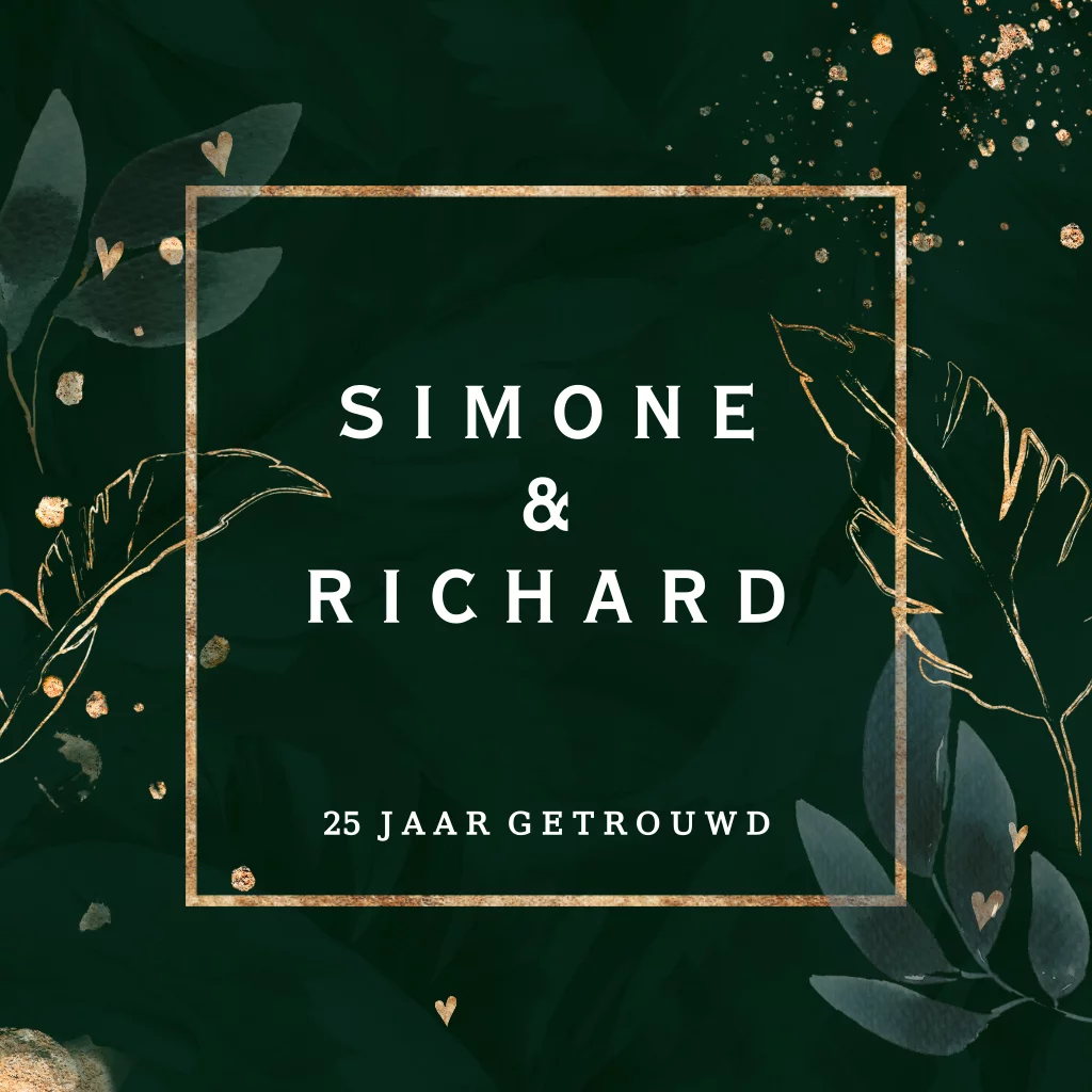 Prachtige uitnodiging voor jullie 25 jarig huwelijksjubileum met donkergroene achtergrond, bladeren en goudlook elementen.