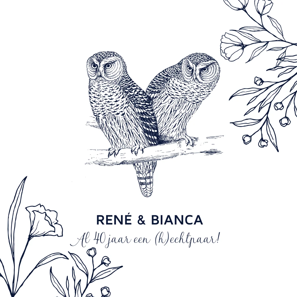 Uitnodiging voor een huwelijksjubileum met chique getekende bloemen en twee prachtige getekende 'oude uilen' zittend op een tak. Alle illustraties en tekst in een donker blauwe kleur. Liever een andere kleur? Je kunt de kleur heel makkelijk zelf aanpassen in onze editor, probeer maar!