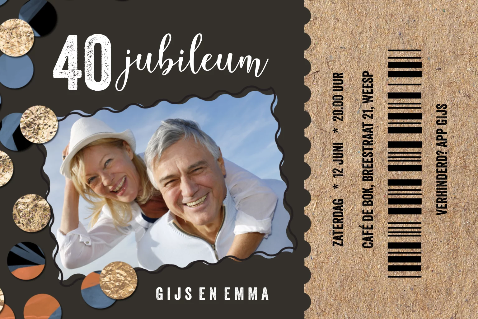 Feestelijke 40 jarig huwelijksjubileum in de vorm van een ticket met foto ruimte. Met kraft look en confetti.