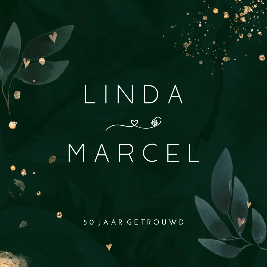 Prachtige uitnodiging voor jullie 50 jarig huwelijksjubileum met donkergroene achtergrond, bladeren en goudlook elementen.