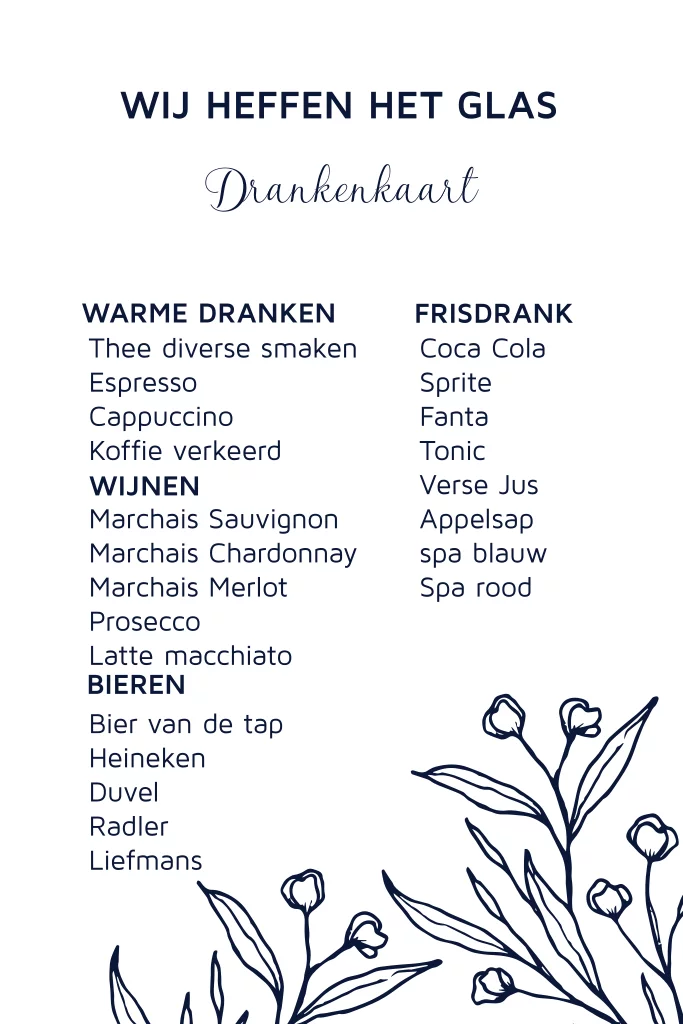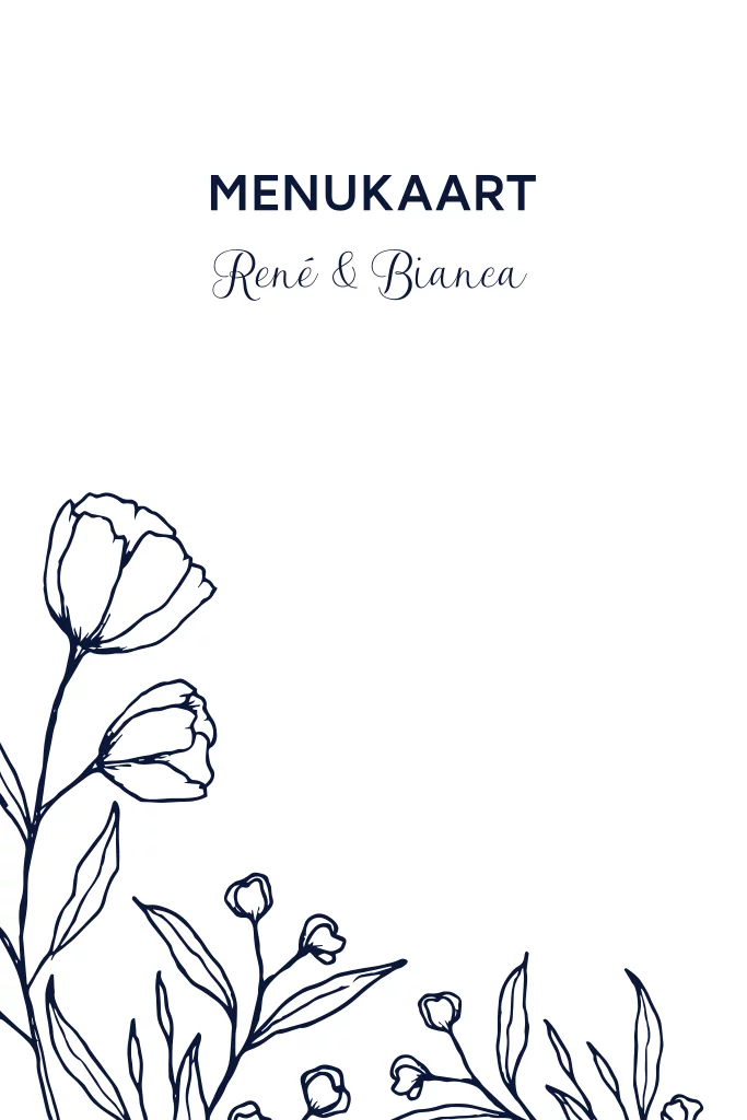 Stijlvol menukaart voor bij jullie huwelijksjubileum diner. Versierd met getekende bloemen in een Delfstblauwe kleur. Liever een andere kleur? In onze editor pas je deze gemakkelijk aan in de kleur die bij jullie past.