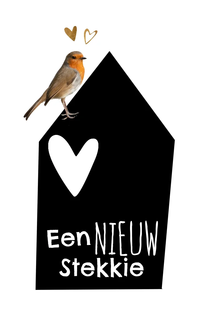 Black and white verhuiskaart met vogeltje, huisje en hart. Alles is aan te passen! Formaten 10x15cm, 11x17cm en 14x21cm. 2-zijdes die je kan opmaken!